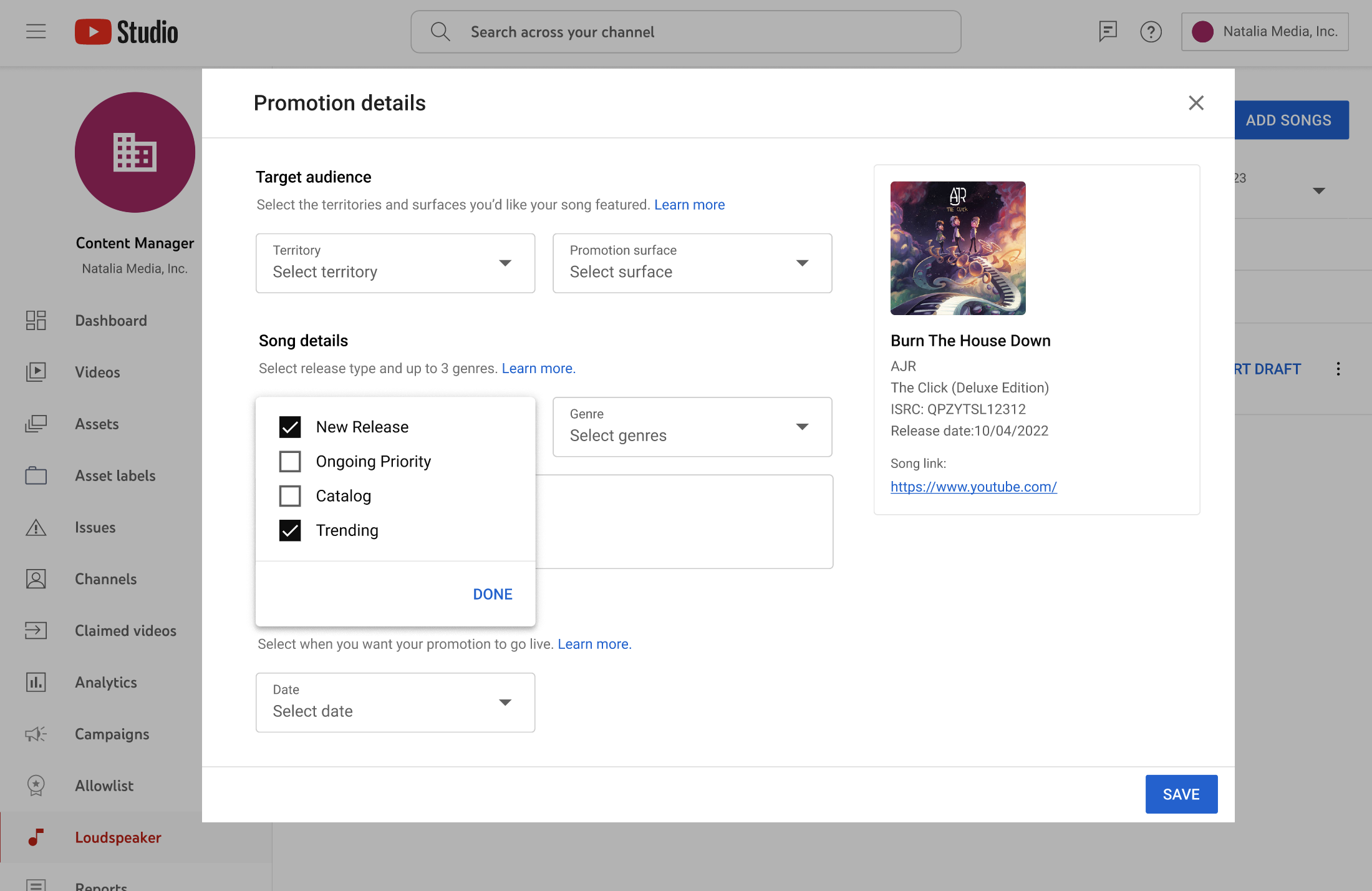 Loudspeaker 1.0 is a promotional hub that enables Labels/Distributors to highlight their priority content to be utilized as a signal for potential placement across YouTube surfaces. Loudspeaker 1.0 is the building block for future enhancements that will build the product into a true promotional hub.