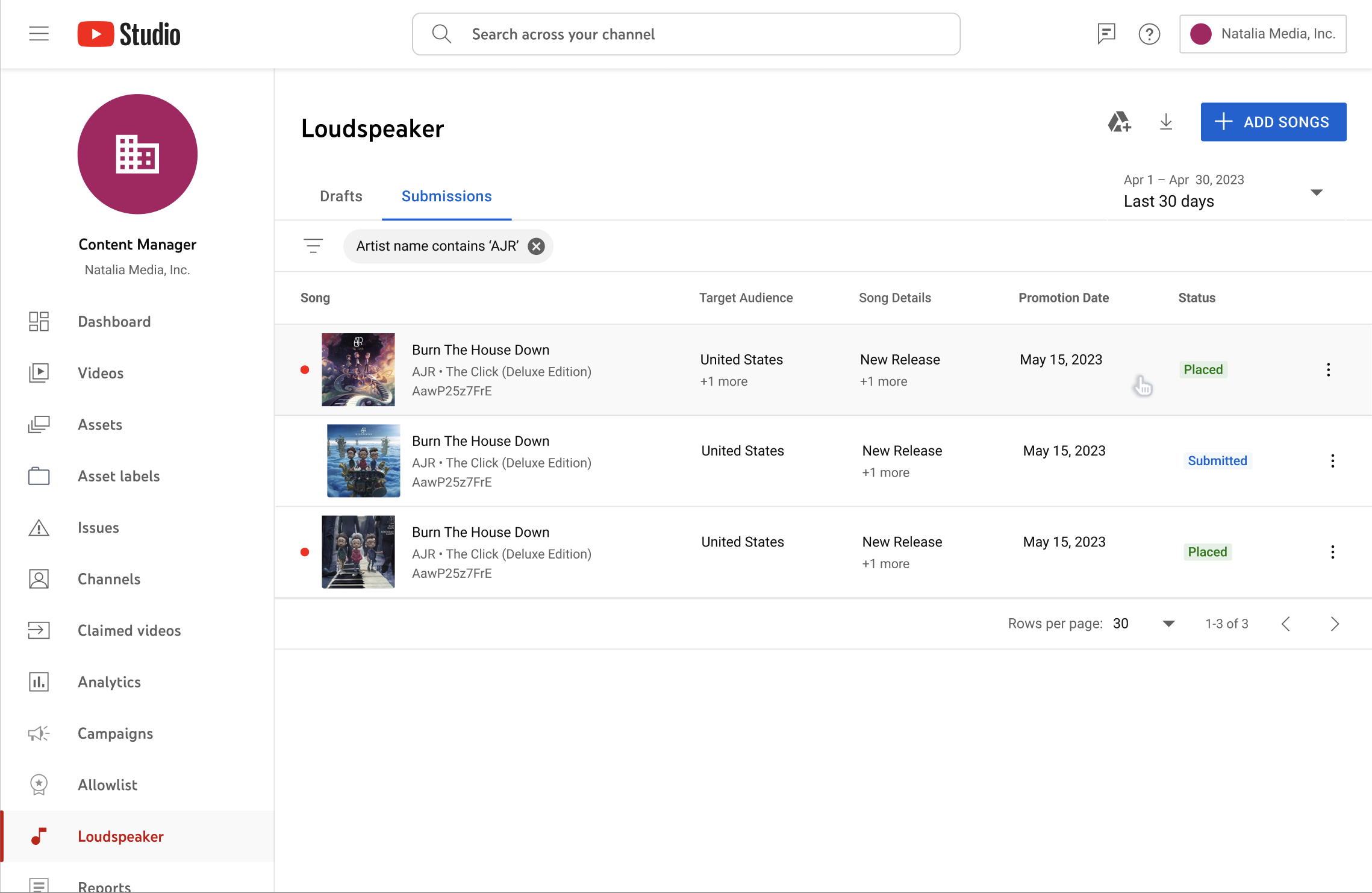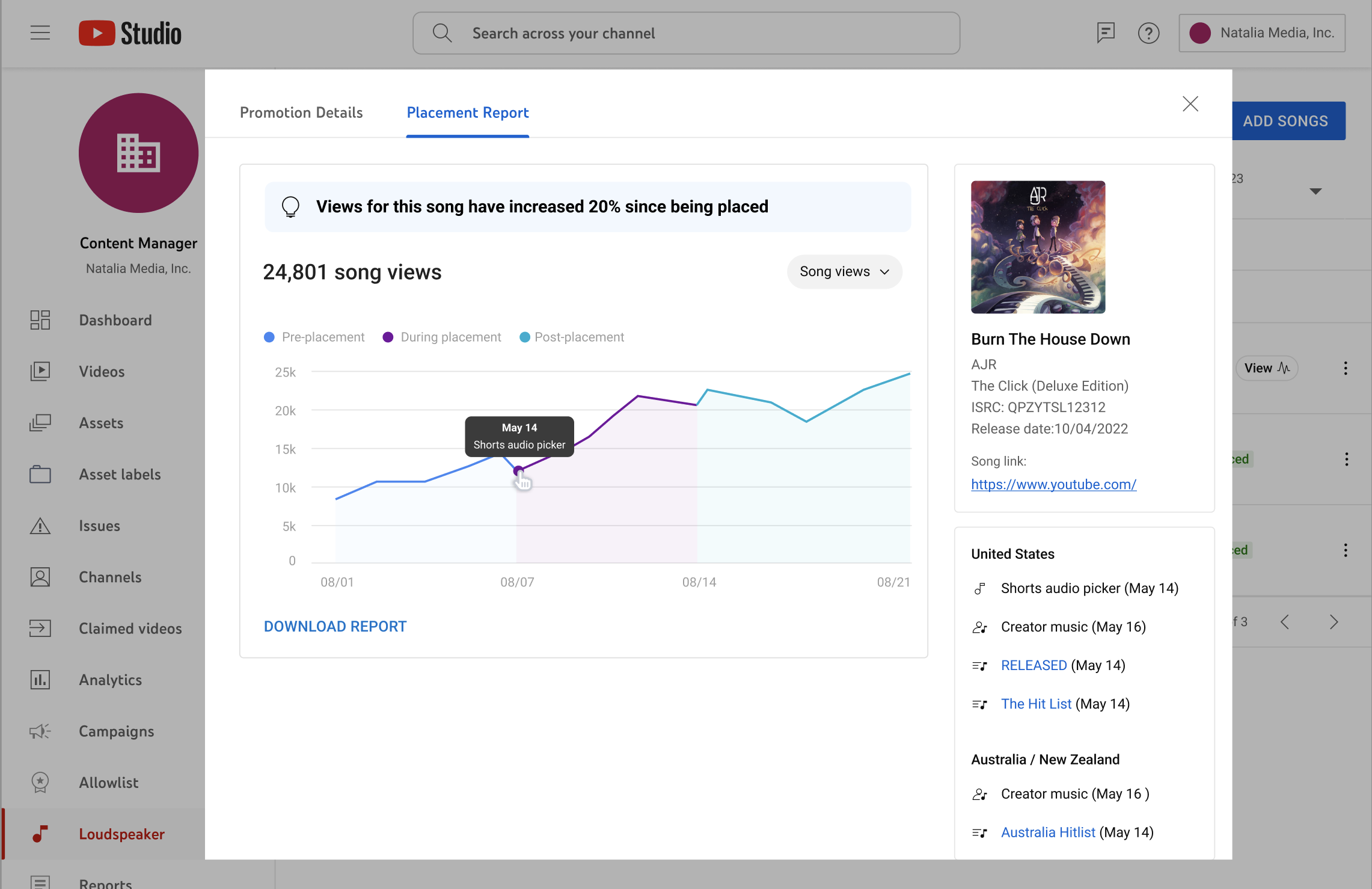 With Loudspeaker, content owners can check on the status of their submissions at anytime. If their submissions were placed, hovering over the badge will reveal a tooltip of where the song has been placed across the different YouTube surfaces and dates that the placement started. If there were any placements on playlists, direct links will be accessible for them to view directly.