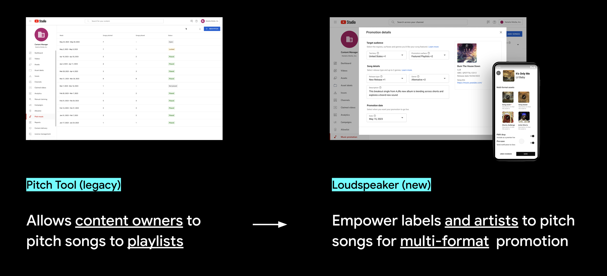 With the previous Pitch Tool, once labels/content owners submitted a music sheet to SPMs or YouTube’s programming team, they would have to wait for a manual outreach of if their songs were places on a playlist or not. If they were placed, it would be a manual process to know where it was placed and they would have to go searching for those playlists.
