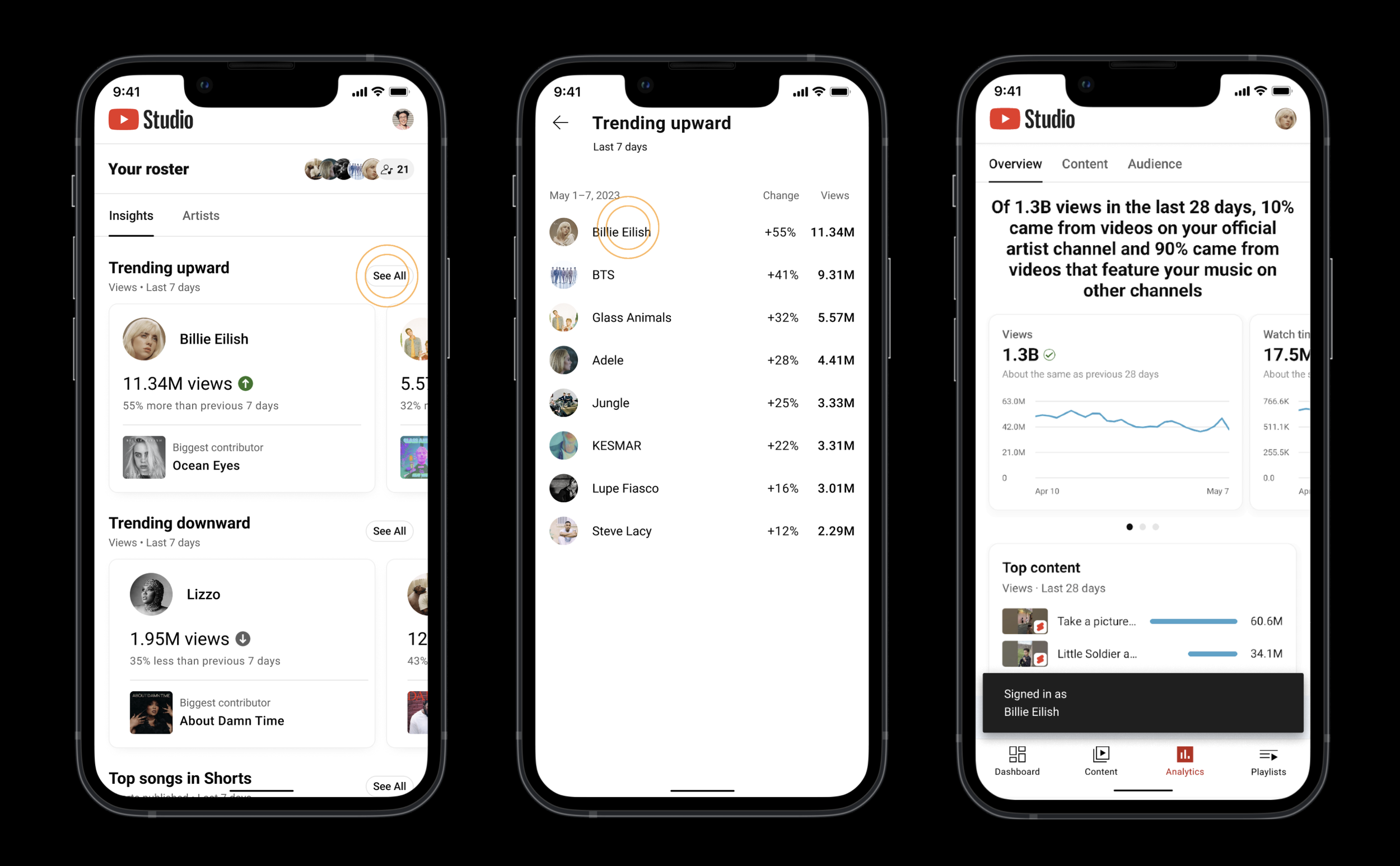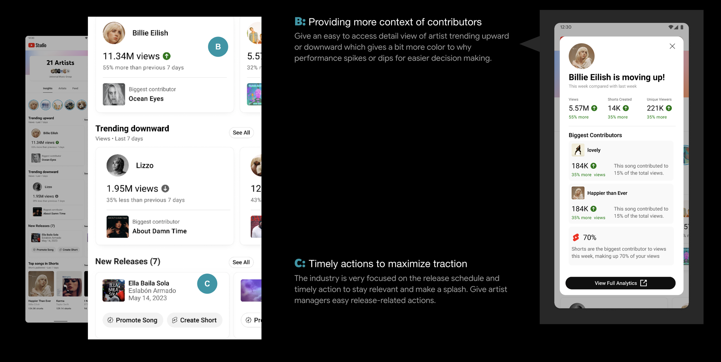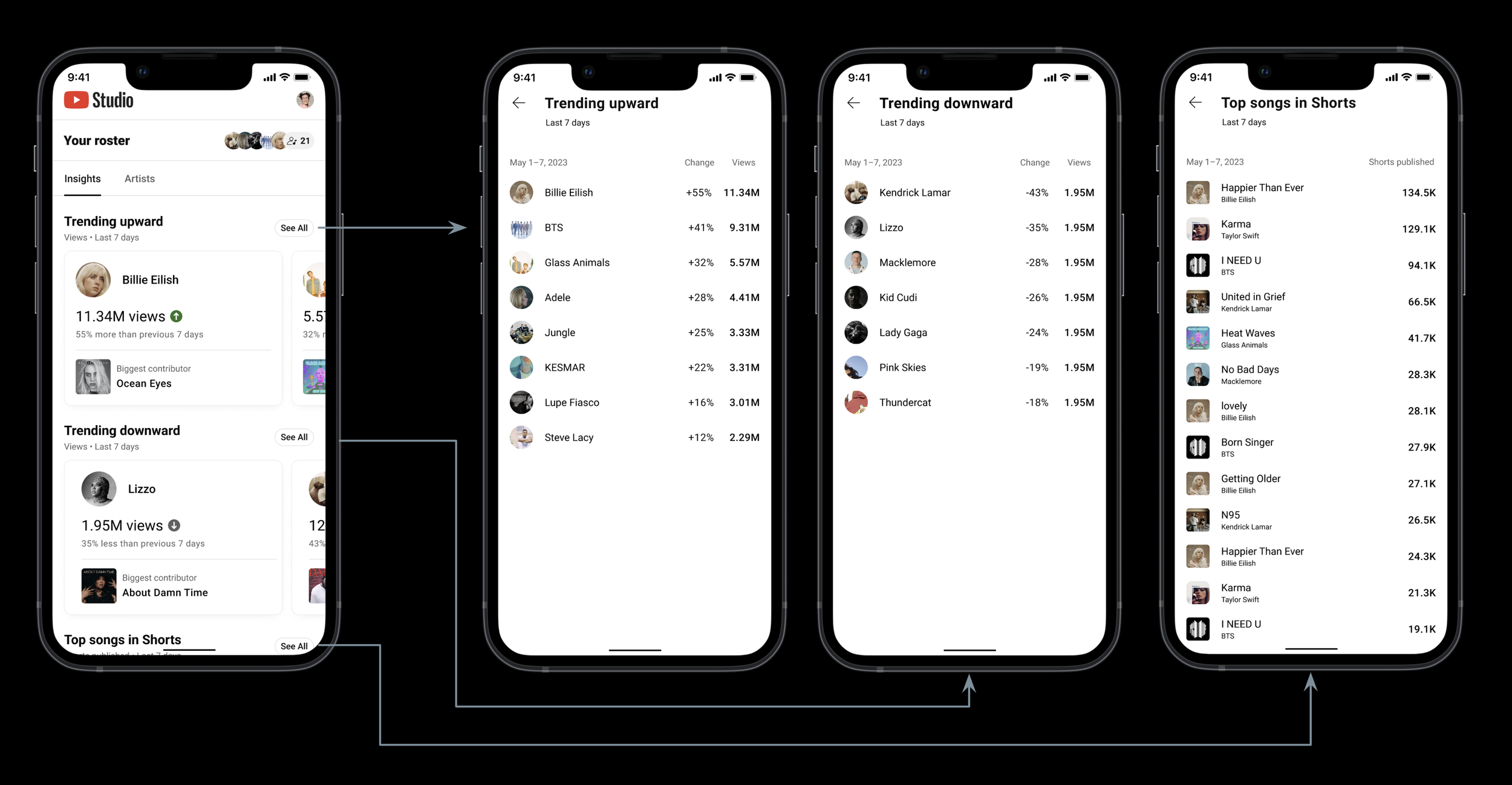 For an artist managers, key performance indicators like view count, trending songs, and songs in Shorts activity are integral to knowing what to drill-down on and view in more detail.
