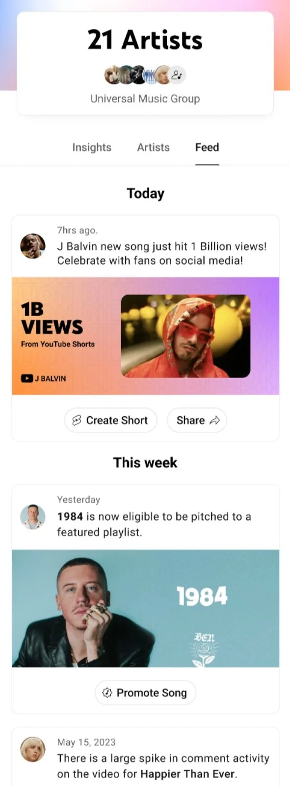 “Wondering how to access and look at analytics across our entire roster, and wondering how to group multiple artists together. Make it easier than logging out of one channel and into another.”