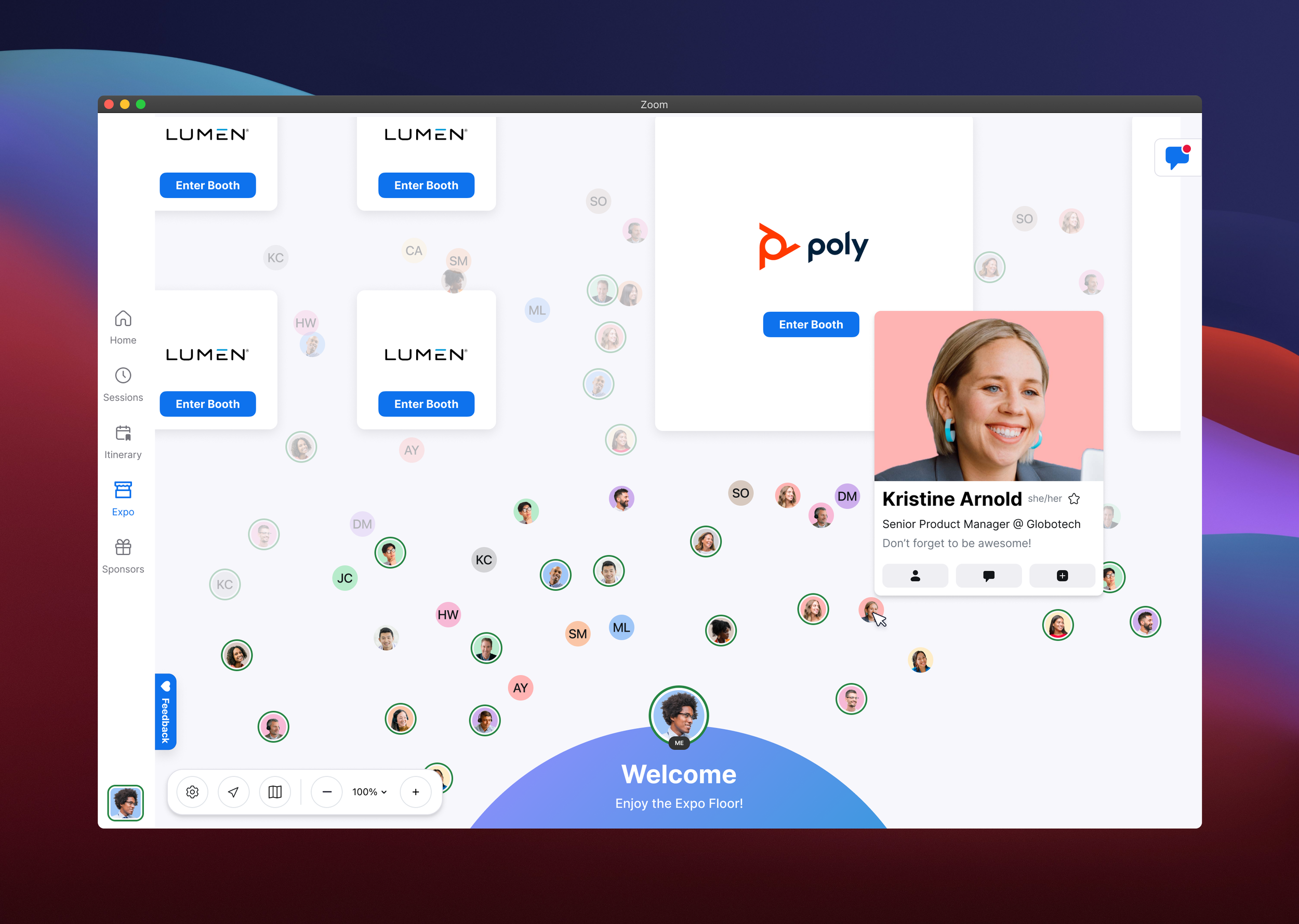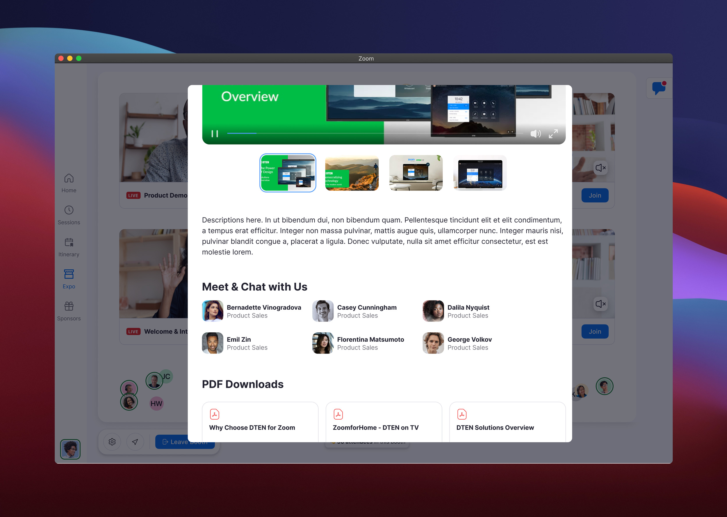 Zoom Events Expo is a space that drives meaningful connections, facilitates networking, and increases sponsor engagement and lead generation. The perfect complementary experience to the typical, one-way virtual event functionality. Expo provides face-to-face connection between attendees, hosts, and sponsors - a value-add that wins over many prospective customers looking to differentiate their virtual events.