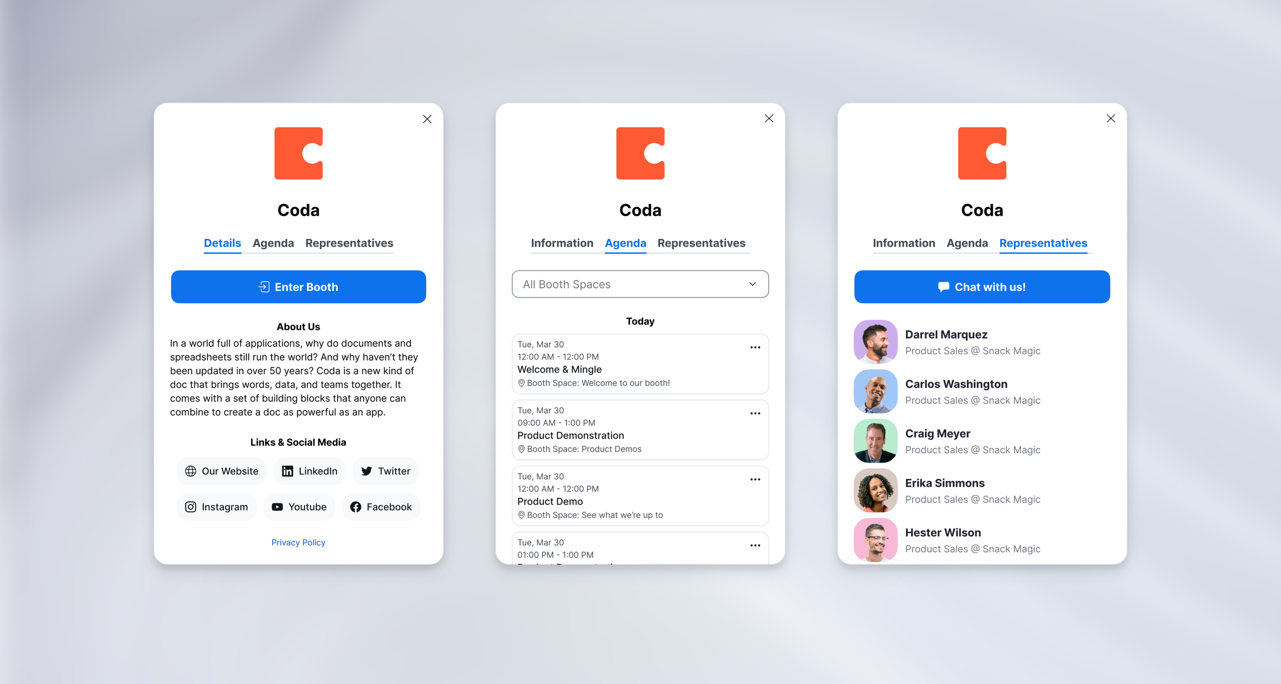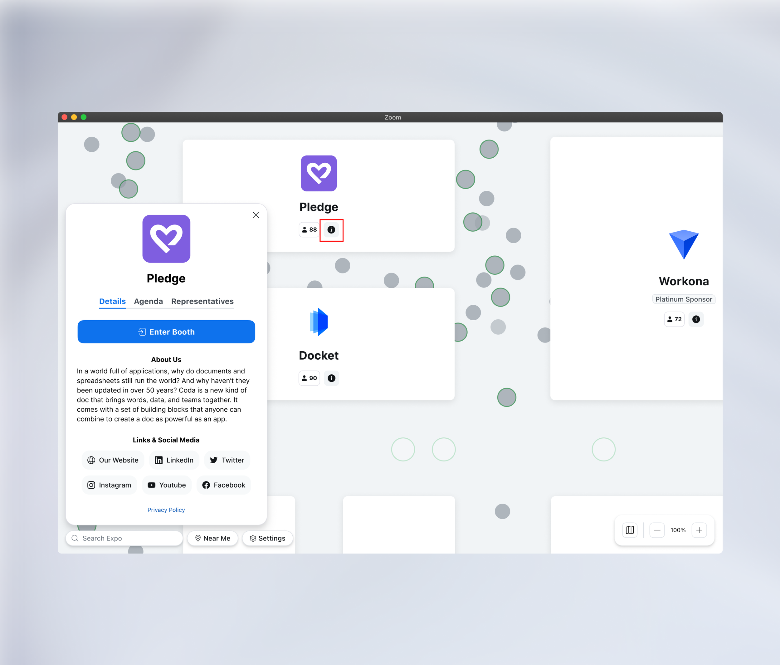 Clicking on the info icon on the booth card, opens up a panel on the left-side, leveraging the exhibitor profile card, which is accessible outside and inside the booth. This has key information for people to learn more about the exhibitor (description, social links, representatives, etc), as well as view the agenda for what’s happening in the booth and when.