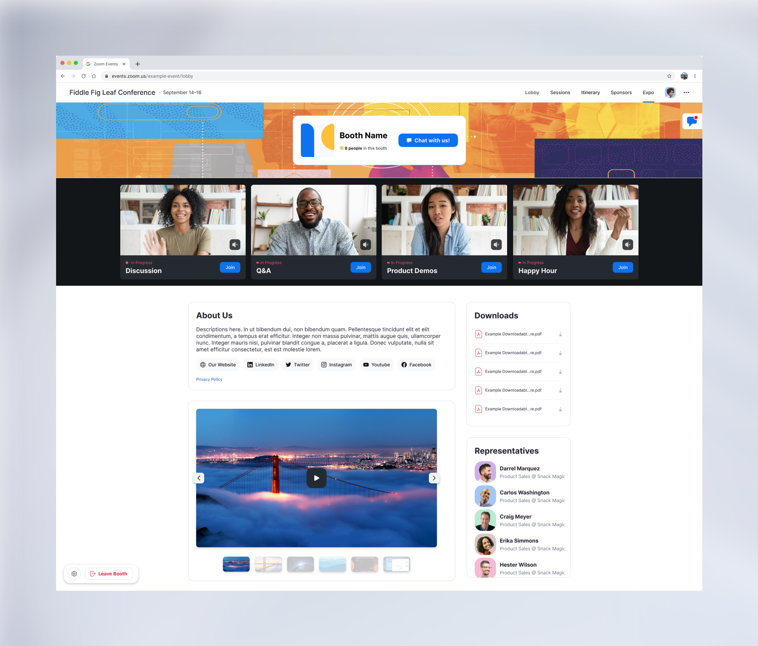 This view of the expo keeps all of the value of the expo inside the booth but does away with the avatar navigation. Some may like the simple view, so we allow event organizers to choose between Spatial View and Simple View.