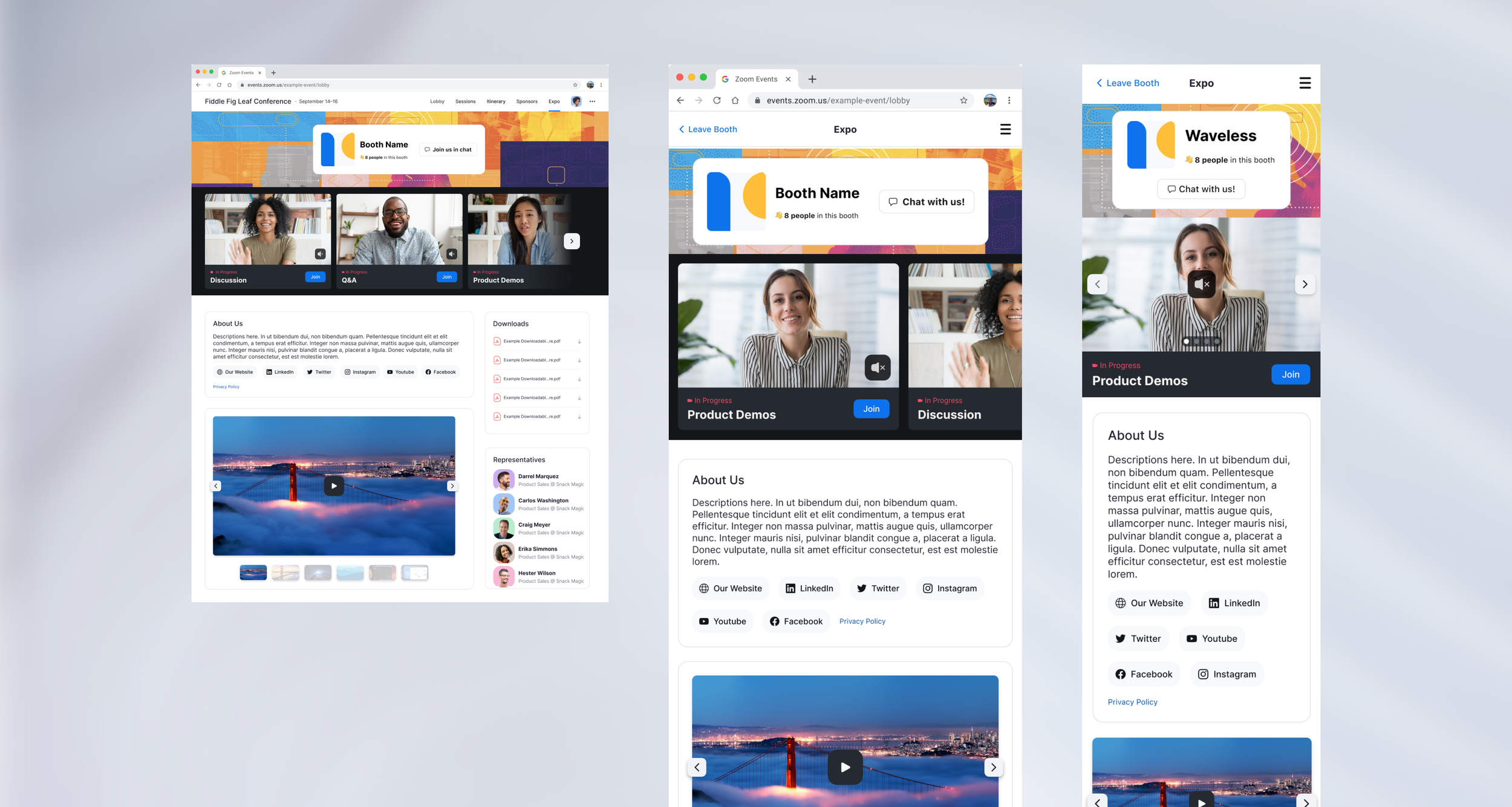 This allows Zoom Events Expo to scale almost infinitely, as it is much less of a performance load than Spatial View. Additionally, Simple is much more scalable across devices while Spatial View is only available on tablet and larger breakpoints.