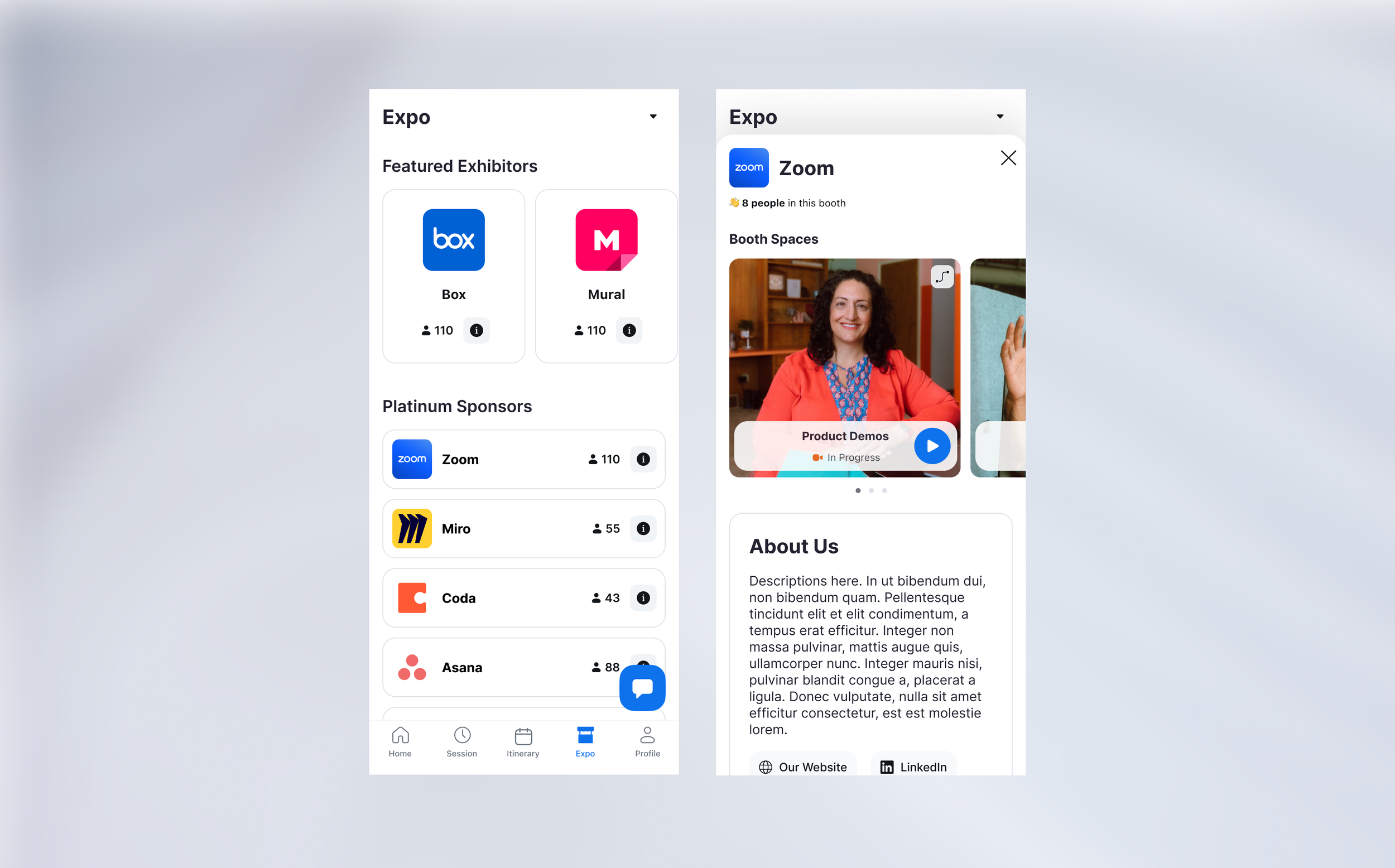 We made significant improvements to the exterior of the booth on the expo floor. Previously, we just had the logo and an “Enter Booth” button. In the new booth card, we added a printed name of the exhibitor/booth, the number of people in the booth, and an info button to learn more before entering into the booth. For sponsor booths, we have also included the sponsor tier. I did away with the primary CTAs on every booth to reduce visual clutter conflicting with the logos, and simplified the tap target to enter the booth to be a click anywhere on the booth card.