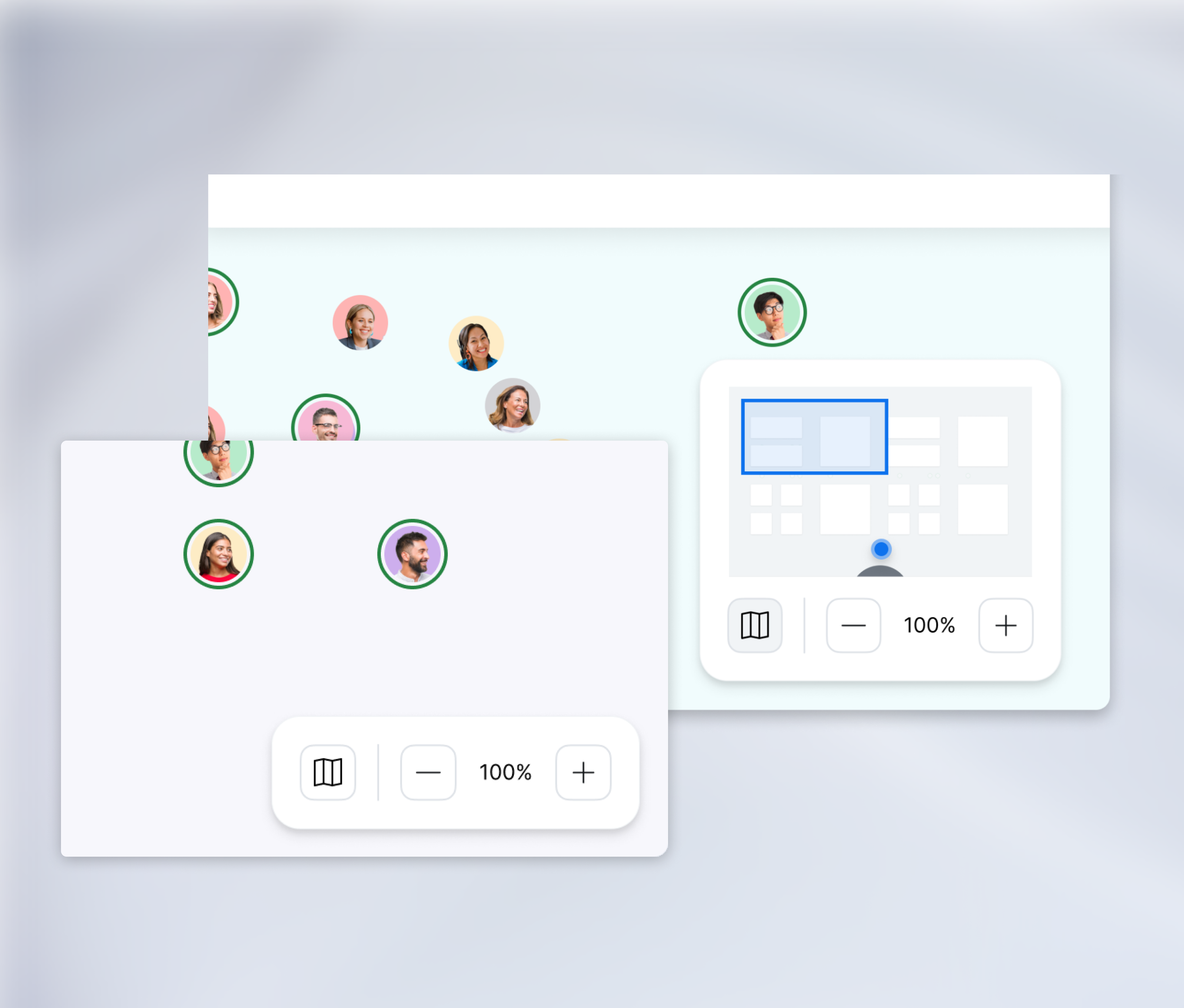 In the bottom right-hand corner, I centralized “view” controls. You can adjust your zoom level, and based on your zoom level, your view-port is visualized in the blue box superimposed on the mini-map. This shows you how much of the full expo floor you’re looking at. The blue dot signifies where your avatar's location is.